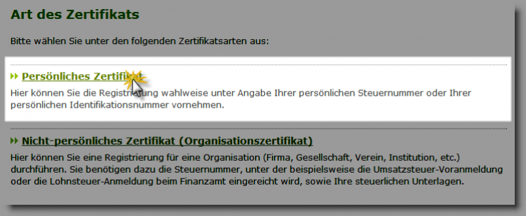 Daraufhin landen Sie wieder im ursprünglichen Auswahlmenü. Hier klicken Sie auf den Link "Schritt 1: Angaben zu Person und gegebenenfalls Organisation" und dann auf "Persönliches Zertifikat":