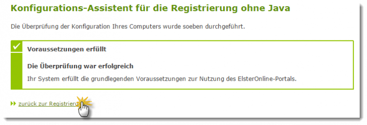 Sollte die Prüfung ergeben, dass die technischen Voraussetzungen bei Ihrem Computer nicht erfüllt sind, folgen Sie den Hinweisen des ElsterOnline-Betreibers zur Fehlerbehebung. War die Überprüfung erfolgreich, setzen Sie Ihre Anmeldung fort. Dazu klicken Sie auf den Link "Zurück zur Registrierung" am unteren Seitenrand: