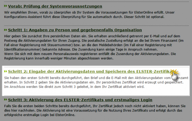 Sobald dieser Brief bei Ihnen eingetroffen ist, öffnen Sie die Elster-E-Mail mit der Aktivierungs-ID (Betreffzeile: "ElsterOnline-Portal: Aktivierung Ihres Benutzerkontos") und klicken dort auf den Aktivierungs-Link. Daraufhin landen Sie wieder im zentralen Auswahlmenü: Diesmal klicken Sie hier auf den Auswahlpunkt "Schritt 2: Eingabe der Aktivierungsdaten und Speichern des ELSTER-Zertifikats":