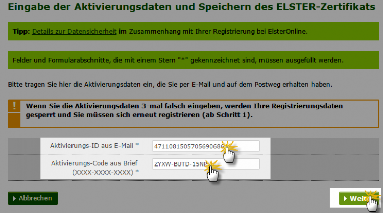 Registrierungsschritt 2: Aktivierungsdaten eingeben und Elster-Zertifikat speichern