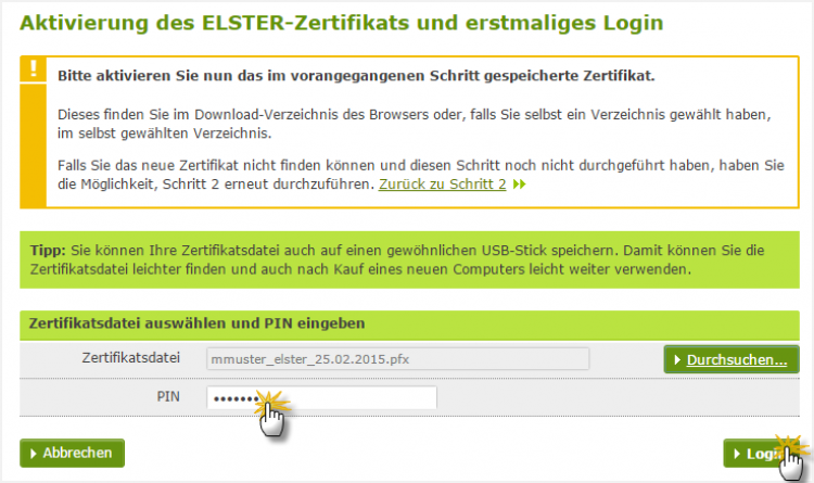 Bitte beachten Sie: Diese drei Schritte sind nur einmalig erforderlich. In Zukunft können Sie Ihre elektronischen Steuererklärungen direkt über das ElsterOnline-Portal oder aus einer Elster-kompatiblen Steuer- oder Buchführungssoftware heraus signiert ans Finanzamt übermitteln: Sie brauchen nur den Speicherpfad des Signatur-Zertifikats einzutragen und Ihre PIN einzugeben.