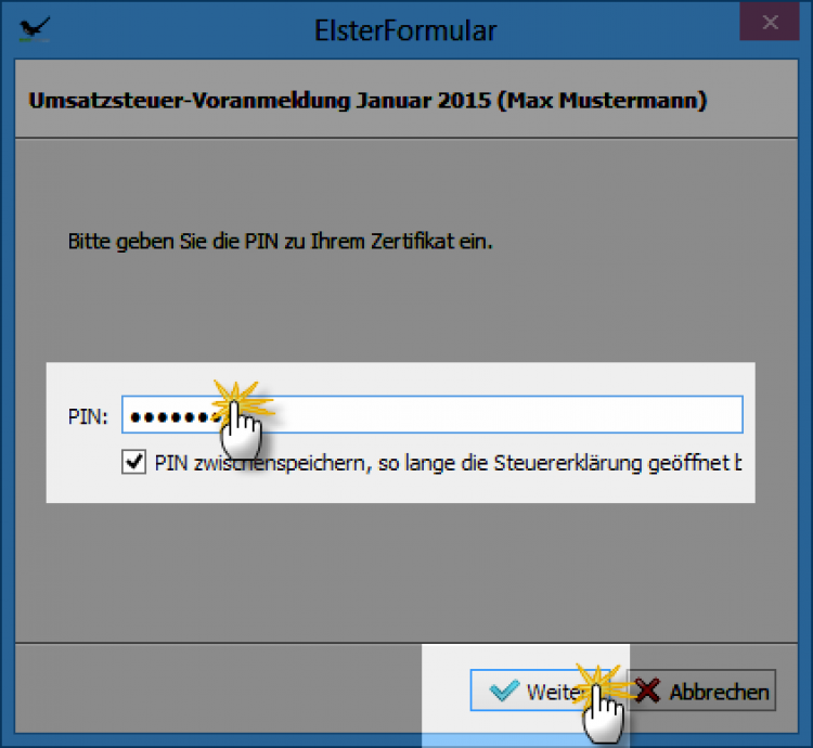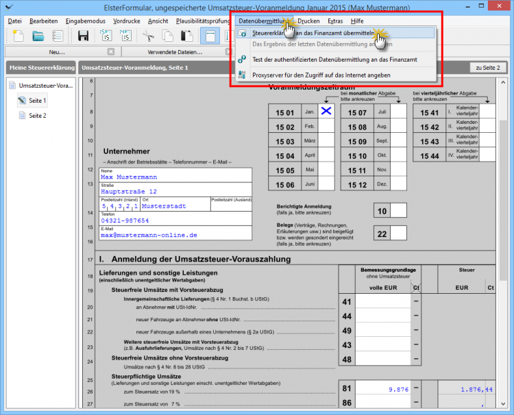 Eingabe der Steuerdaten, Speichern der Voranmeldung und Start der Datenübermittlung