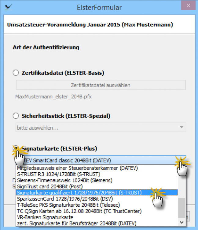 Angenommen, Sie haben eine Signatur-Chipkarte mit dazugehörigem Lesegerät (zum Beispiel vom Sparkassen-Signaturzertifizierer S-Trust) und erledigen Ihre Umsatzsteuervoranmeldungen mit der Steuersoftware ElsterFormular. Dann