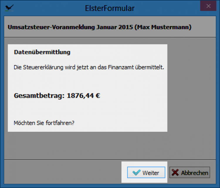 Mit "Weiter" sorgen Sie für die endgültige Übermittlung Ihrer elektronisch signierten Umsatzsteuervoranmeldung.