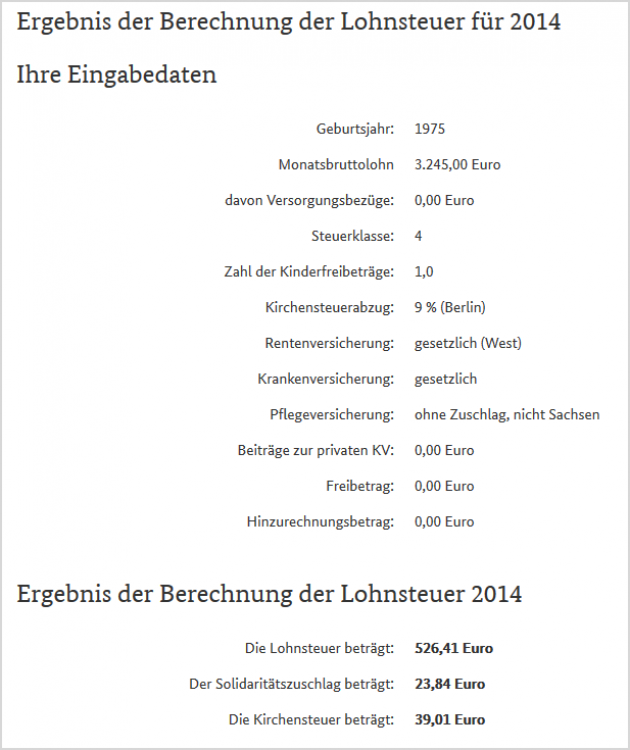 Das Ergebnis einer Lohnsteuerberechnung im Jahr 2014