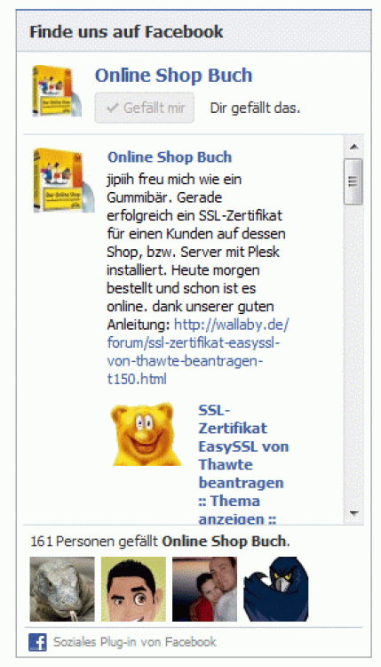Like-Box: Die haben Sie bestimmt schon oft gesehen - eine etwas größere Facebook-Box, meist in der rechten Spalte. Darin sehen Sie die Fananzahl (wenn von Ihnen gewünscht auch mit Profilbildern) der jeweiligen FB-Seite und/oder einen kurzen Stream der FB-Seite. Durch Klick auf "Gefällt-mir" in dieser Box kann Ihr Website-Besucher sofort Fan Ihrer FB-Seite werden, ohne Ihre Facebook-Seite zu besuchen. Er verbleibt also auf Ihrer Website oder in Ihrem Shop (wo Sie ihn ja auch haben wollen). Ist der Besucher momentan parallel bei Facebook eingeloggt, sieht er ggf. auch Kontakte von sich, die bereits Fan Ihrer Seite sind.