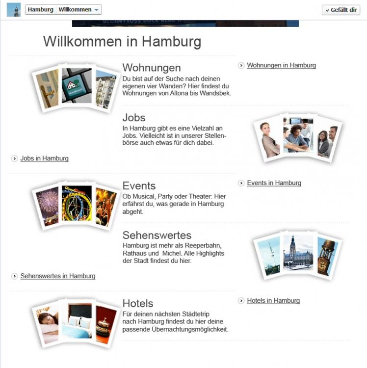 Die iFrame-Tabs von Hamburgs Facebook-Seite: Verschiedene Tabs bieten unterschiedliche Inhalte mit Mehrwert für verschiedene Zielgruppen an, z.B. Wohnungen.