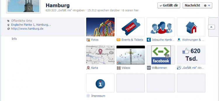 Wichtig ist, wie Sie die Inhalte auf der Facebook-Seite aufteilen wollen. Wollen Sie nur einen Tab mit weiteren Links zu Unterseiten anbieten, oder Ihre Inhalte lieber auf verschiedene Tabs verteilen? Die unten abgebildete Hamburger Facebook-Seite nutzt mehrere Tabs, weil sie verschiedene Zielgruppen bedienen will. Wenn Sie statt dessen auf eigene Tutorials verlinken und diese sich auf ein einzelnes Thema konzentrieren, dann können sie diese alle von einem einzigen Tab aus direkt verlinken. Welche Aufteilung sinnvoll ist, hängt also von Ihrem Angebot ab.