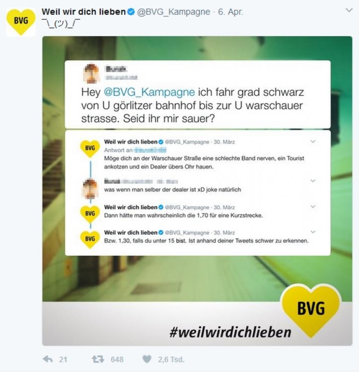 So steif, wie der Begriff klingt, muss Unternehmenskommunikation im Internet nicht sein. Das zeigen die Berliner Verkehrsbetriebe mit ihrer legendären Twitter-Kampagne. Aber professionell sollte man nach Möglichkeit auftreten, überlegt und kontrolliert. Und das ist auch hier der Fall, selbst wenn es frisch, spontan und frech daherkommt. Das Posting beruht auf einer wohlüberlegten Strategie, die die gesamte Kampagne prägt.