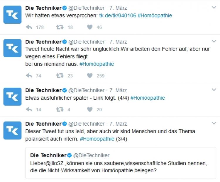Das Problem ist hier nicht, welche Seite recht hat, Homöopathiebefürworter oder -gegner. Sondern dass man als Krankenversicherung diese Diskussion auf keinen Fall auslösen und noch weniger als aktiver Parteigänger in einer derart kontroversen Frage dastehen will, die die eigenen Mitglieder entzweit. Ein entsprechend polemischer Tweet GEGEN Homöopathie wäre aus PR-Sicht genauso ein Fehler gewesen.