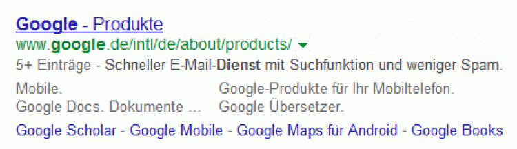 Für Google gehört natürlich eindeutig auch Gmail zu diesen „Diensten“. Und wer auf Google selbst nach „Google Dienste“ sucht, der erhält in der ausgewiesenen Liste als Top-Suchergebnis den Link „Google-Produkte“ und dort prominent den Hinweis auf den schnellen E-Mail-Dienst von Google mit Suchfunktion und weniger Spam, nämlich Gmail: