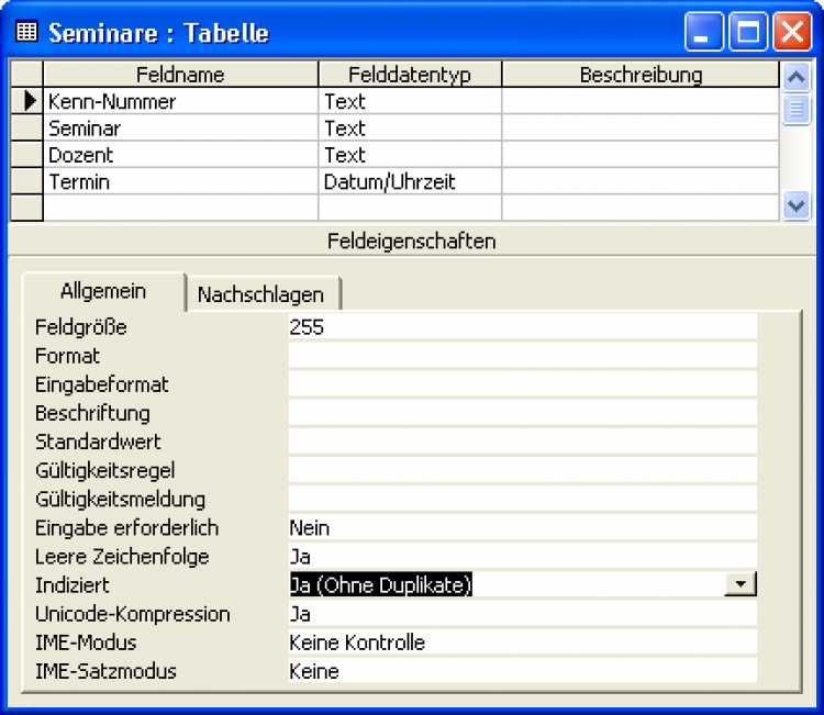 Damit nicht die Kennung doppelt vergeben werden kann, lassen Sie Access das bei jeder Eingabe selbst prüfen. Im Tabellen-Entwurf stellen Sie die Indiziert-Eigenschaft auf Ja (ohne Duplikate), dann lassen sich keine Kennungen wiederholen: