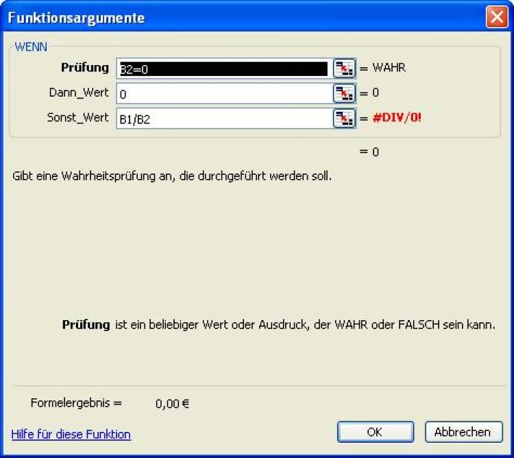 Prüfung: Im ersten Teil der Formel wird die Zelle, durch die dividiert wird, gleich Null gesetzt.