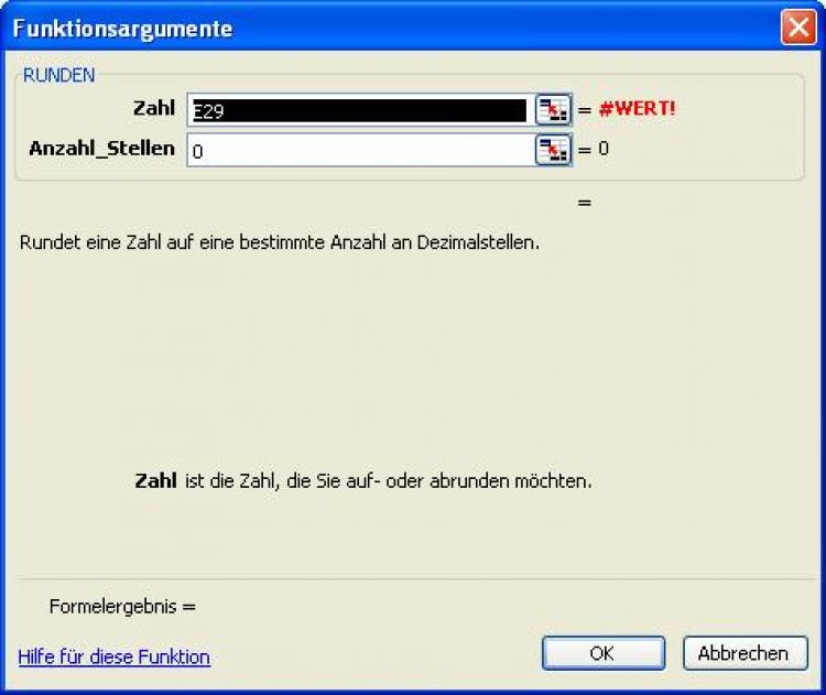 Fehler werden bereits im Dialogfeld Funktionsargumente angezeigt.