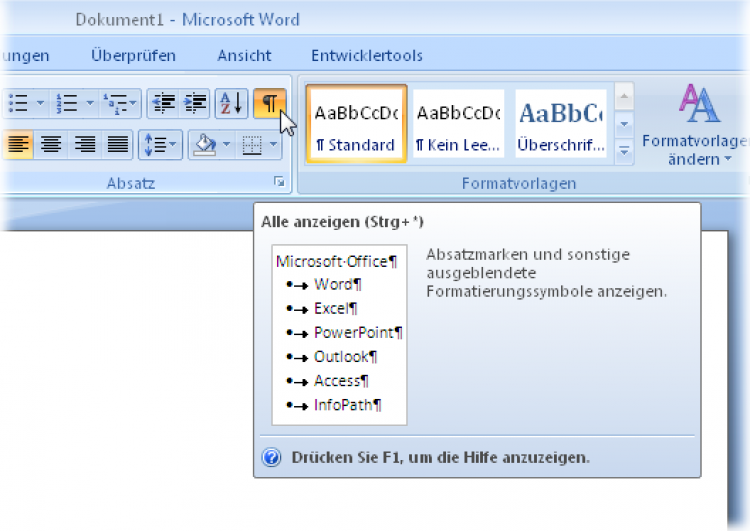 Wollen Sie diese Formatierungszeichen nicht sehen, klicken Sie ab Word 2007 auf der Start-Registerkarte in der Absatz-Gruppe auf das AlleAnzeigen-Symbol oder nutzen das Tastenkürzel Strg+*.
