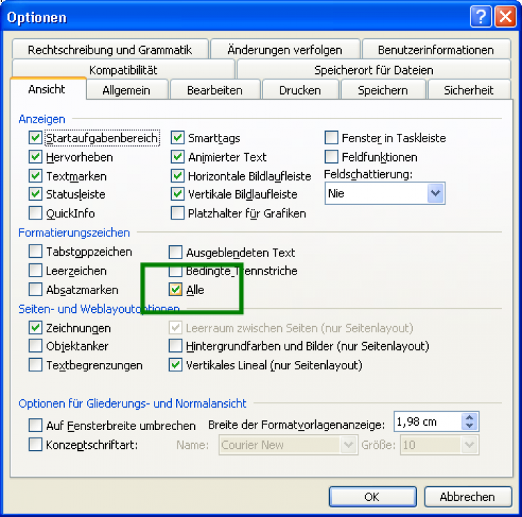 Mit dem Kontrollkästchen Alle zeigen Sie die Formatierungszeichen an