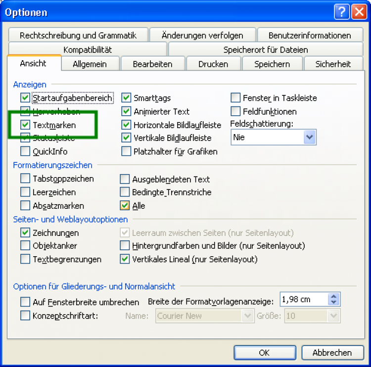 Textmarken lassen sich mit dieser Option sichtbar machen