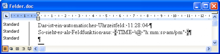 Die Anzeige der Felder schalten Sie für das gesamte Dokument mit dem Tastenkürzel Alt+F9 um, für ein einzelnes markiertes Feld mit Umschalt+F9. Dabei wechselt Word jeweils zwischen der Feldfunktion und der Anzeige des Ergebnisses.