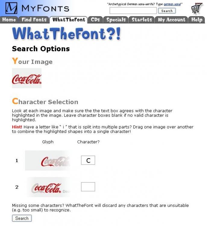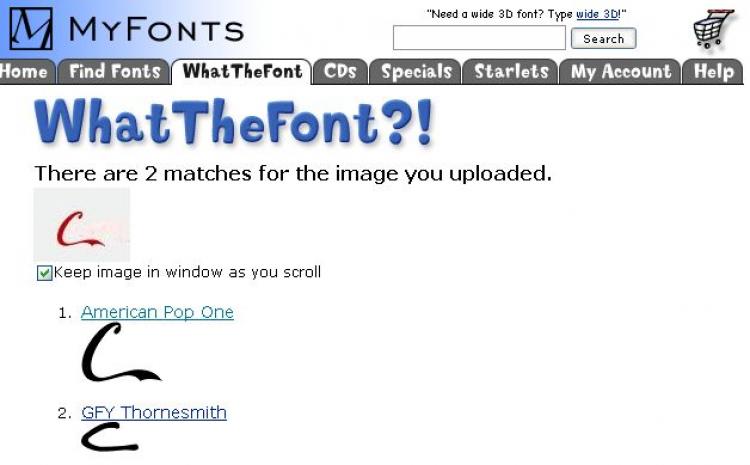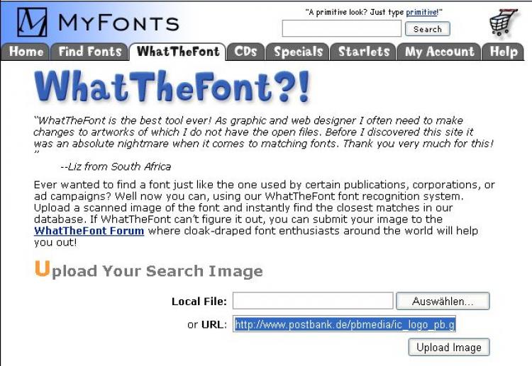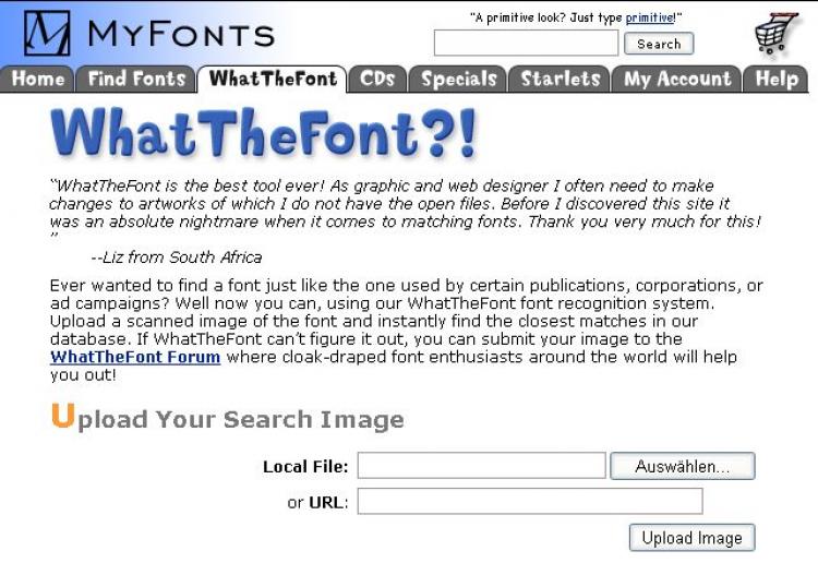 Am einfachsten ist die Schriftarterkennung bei MyFont/WhatTheFont. Hier wird die Schrift mithilfe eines Bildes erkannt. Das ist ausgesprochen praktisch, weil Firmenlogos als JPG, GIF oder in einem ähnlichen Format im Internet auftauchen und auf diese Art schnell ausgelesen werden können.