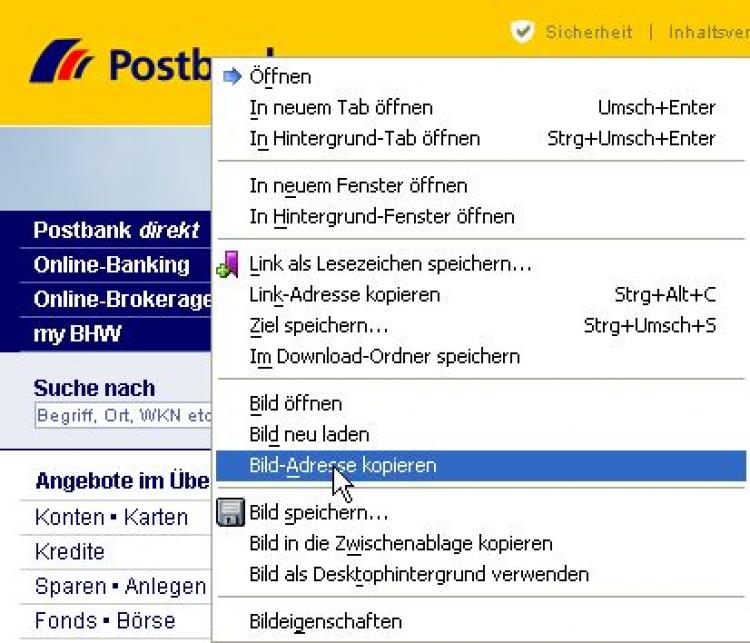 Am Beispiel der Postbank sehen Sie, wie einfach das geht. Zuerst kopieren Sie die Bild-URL vom Postbank-Logo: