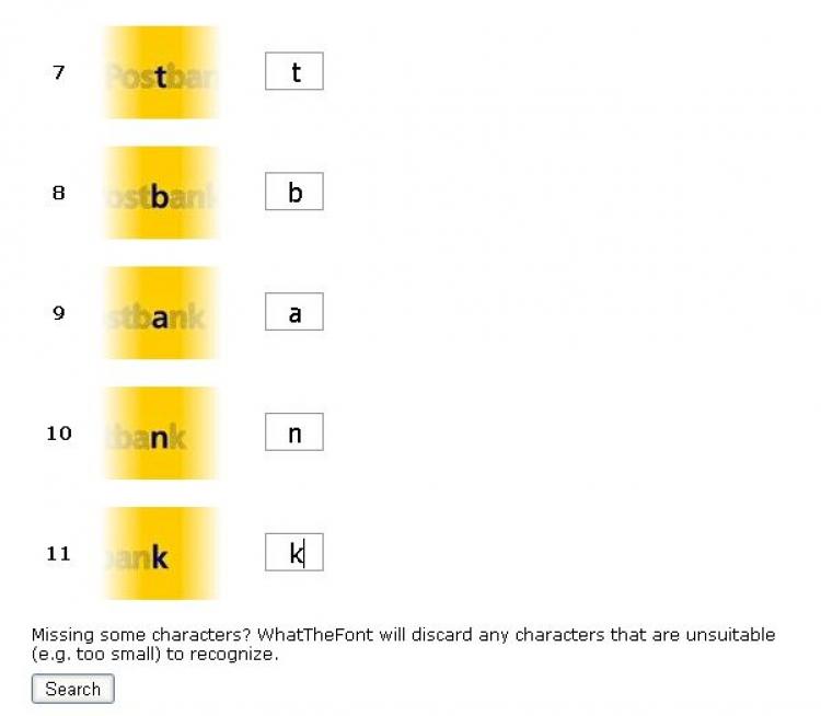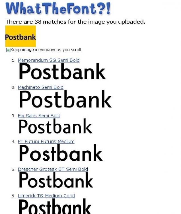 Obwohl natürlich per Augenschein sofort zu sehen ist, dass die Schriften 4-6 im obigen Bild wegen des falschen "a" nicht korrekt sind, ist der Algorithmus durchaus brauchbar. Außerdem gehe ich davon aus, dass die Postbank sich eine eigene Hausschrift hat designen lassen, die nicht frei zugänglich ist. Dafür ist der erste Treffer optisch schon sehr dicht am Original dran.