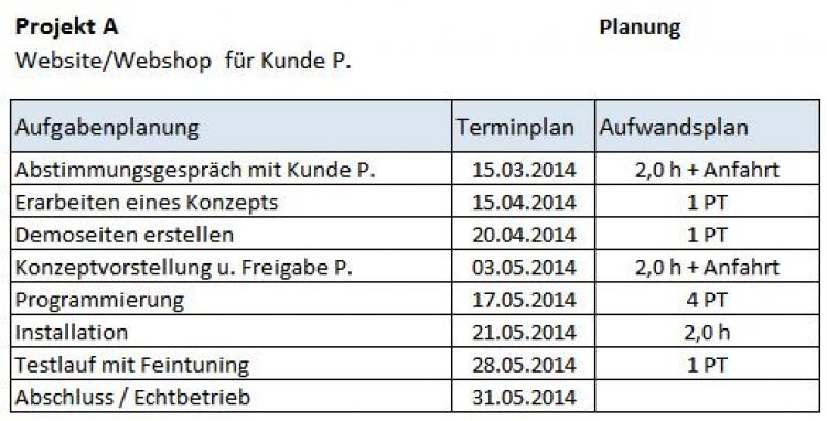 Beispiel Projektplan A: Insgesamt beträgt die geplante Laufzeit 2,5 Monate. Die Arbeitspakete werden fast ausschließlich selbst erledigt, der eigene Aufwand soll insgesamt ca. 8 Personentage betragen. Dies umfasst die Programmierung und die Kundentermine.