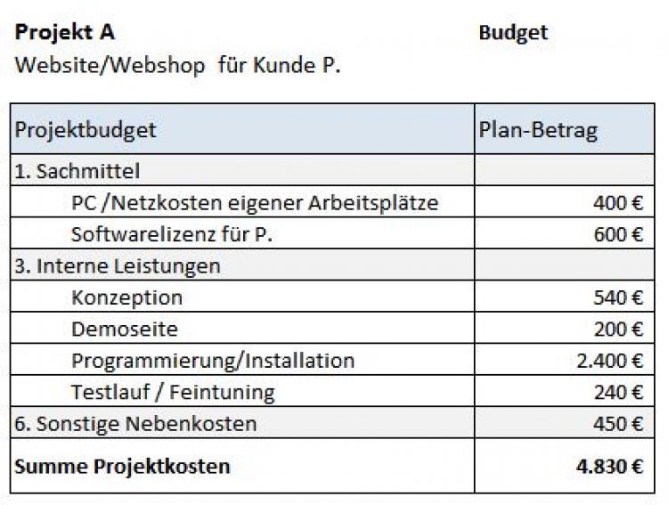 In die Tabelle des ursprünglichen Projektbudgets trägt die Webdesignerin die tatsächlich ausgegebenen Beträge in einer eigener Spalte ein. Dazu ergibt sich im Projekt A anhand der Kostenbewertung die folgende Aufstellung
