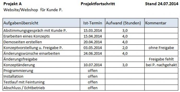Am besten lässt sich dies durch eine tabellarische Aufstellung lösen. Dann steht fest, was geplant war, was bis dato im Projekt geleistet wurde und was diese Leistung gekostet hat. Das sind die wesentlichen Fakten, die Sie kennen müssen. Im Beispiel sieht eine (fiktive) Planung folgendermaßen aus:
