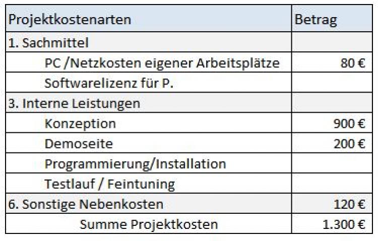 Wie die Aufgabenplanung schon zeigt, besteht der größte Anteil der Kosten im Projekt aus internen Leistungen. Die Webdesignerin hat den Aufwand mit Kosten bewertet, je nachdem ob sie konzeptionell arbeitet, Design-Vorlagen verwenden kann oder echte Neuprogrammierung leisten muss. Dazu kommt noch die Softwarelizenz und einige Nebenkosten.