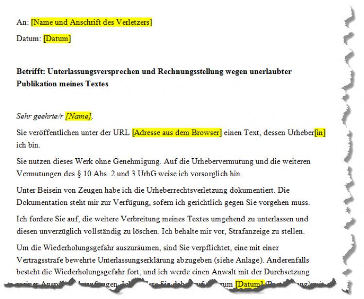 Mitgliedern von akademie.de steht ein Abmahn-Musterschreiben sowie eine Muster-Unterlassungserklärung zum Download bereit: "Plagiat: Musterschreiben auf Unterlassung und Schadenersatz" (Word, 106 kB).
