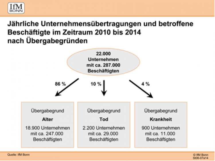 In einer Studie des IFM, Bonn, wurde die Altersstruktur von Betriebsinhabern analysiert: 22,1 % sind zwischen 60 und 64 Jahre, 18,7 % sind zwischen 65 und 69 Jahre alt, weitere 9,8 % sind 70 Jahre und älter.