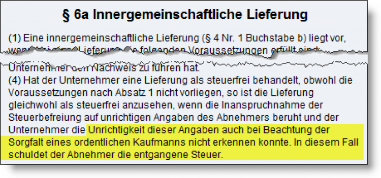 Bevor Sie umsatzsteuerfreie Rechnungen an Auslandskunden schicken, sollten Sie unbedingt darauf achten, dass die vom Kunden angegebene Umsatzsteuer-Identifikationsnummer richtig ist. Warenlieferanten sind dazu laut § 6a Umsatzsteuergesetz sogar gesetzlich verpflichtet. Sie schulden dem Finanzamt die Steuer, wenn Ihr Abnehmer falsche Angaben macht und Sie das "bei Beachtung der Sorgfalt eines ordentlichen Kaufmanns" hätten erkennen können: