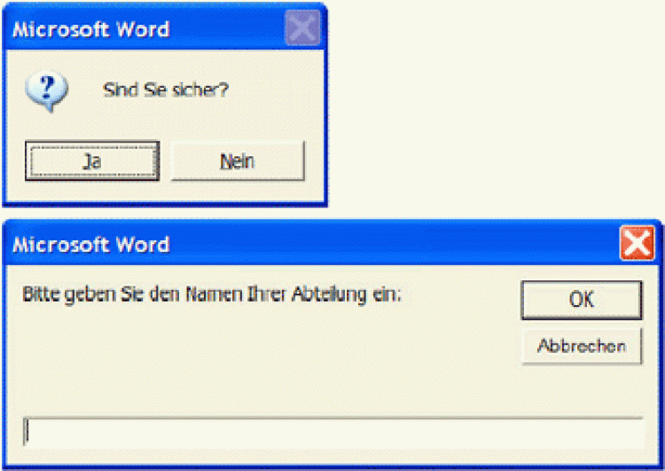 Zur Ausgabe einer einfachen Dialogbox auf dem Bildschirm steht die MsgBox-Funktion zur Verfügung. Wie alle Funktionen können Sie MsgBox auch wie einen Befehl verwenden. Die MsgBox-Funktion zeigt eine Meldungsbox mit einem frei definierbaren Text und verschiedenen Schaltflächen an. Die InputBox-Funktion fordert den Benutzer zur Eingabe eines Textes auf und gibt diesen als Zeichenkette zurück.