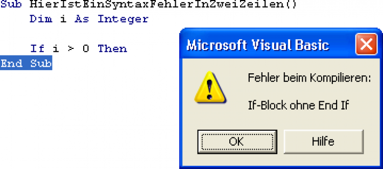 Sicherlich seltener, aber ebenso im Zusammenhang erst aufzuspüren, ist es beispielsweise, ein With mit einem End If zu schließen oder ein Exit Function statt eines Exit Sub einzusetzen.
