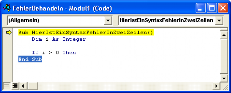Syntaxfehler treten meistens in einer einzigen Zeile auf und können daher vom VBA-Editor direkt erkannt und gemeldet werden. Die typischen Klassiker sind Schreibfehler wie beispielsweise in einem Word/Excel-Formular Me.AktivControl (richtig wäre Me.ActiveControl) oder Auslassungen wie If i > 10 (es fehlt Then dahinter).
