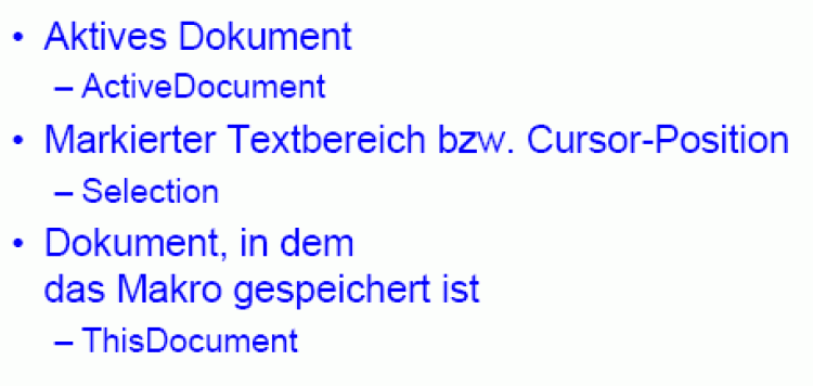 Häufig muss man in einem Makro auf das aktuelle Dokument oder die aktuelle Auswahl verweisen.