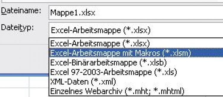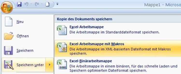 Eine Excel 2007/2010-Arbeitsmappe ohne Makros bekommt die neue Typbezeichnung .xlsx - mit Makros .xlsm. Speichern Sie deshalb Ihre Arbeitsmappen immer in einem dieser Dateiformate. Eine Arbeitsmappe, die Makros beinhaltet, speichern Sie als Excel-Arbeitsmappe mit Makros, also mit der Dateierweiterung ".xlsm".