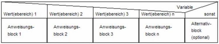 Ein Anweisungsblock wird abgearbeitet, wenn die Variable einen der vorgesehenen Werte besitzt. Alternativ wird ein Alternativblock, wenn vorhanden, gewählt. Andernfalls wird die gesamte Fallauswahl ohne Reaktion verlassen.