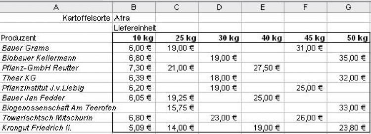 Das Problem kennen Sie bestimmt: Sie möchten das preisgünstigste Produkt aus einer Palette von Angeboten mit verschiedenen Mengen kaufen. Aufgrund der unübersichtlichen Mengenangebote fällt es schwer, den günstigsten Preis zu finden. In der vorliegenden Tabelle bieten diverse Produzenten Kartoffeln der Sorte Afra in unterschiedlichen Abpackungen und Preisen an. Eine Prozedur auswertung ermittelt den günstigsten, eine zweite Prozedur auswertung2 den ungünstigsten Preis.