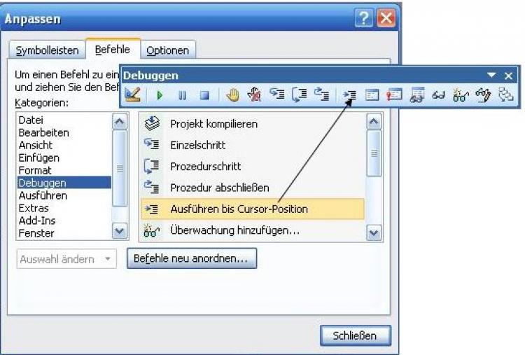 Über "Ansicht" - "Symbolleisten" - "Anpassen" können Sie sich zusätzliche Symbole, z.B. das Symbol "Ausführen bis Cursorposition" hinzufügen. Das erlaubt Ihnen, Ihre Bedienmöglichkeiten zum Test noch zu erweitern.