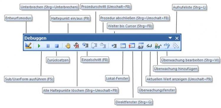 Über "Ansicht" - "Symbolleisten" - "Debuggen" blenden Sie die Symbolleiste Debuggen ein.