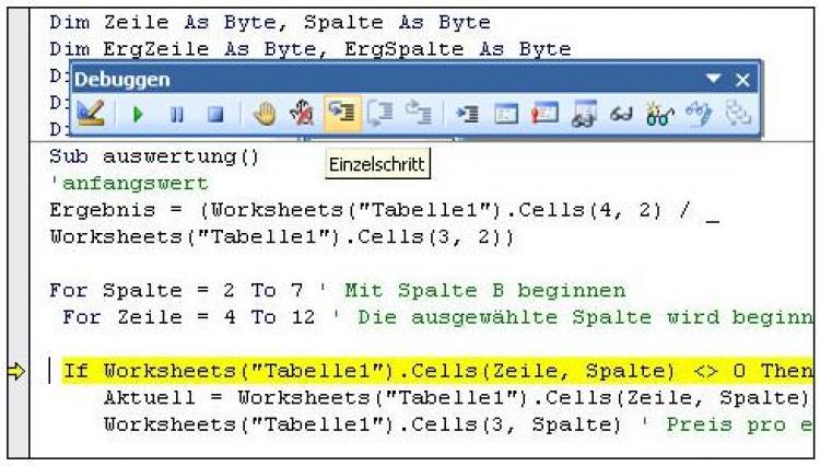 Klicken Sie im VBA-Editor im Modul1 auf eine beliebige Stelle der Prozedur auswertung. Um die Prozedur schrittweise zu testen, wählen Sie entweder "Debuggen" - "Einzelschritt", drücken <F8> oder klicken auf der Symbolleiste Debuggen auf das Symbol Einzelschritt.