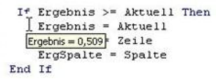 Wenn die Ausführung des VBA-Codes einer Prozedur anhält, z.B. beim schrittweisen Testen, wird Ihnen, sobald Sie den Mauszeiger darüber bewegen, der aktuelle Inhalt einer Variablen in einer QuickInfo angezeigt.