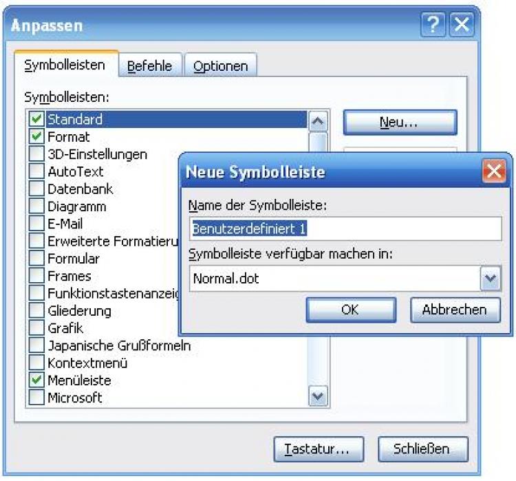 "Extras" - "Anpassen..." auf der Registerkarte "Symbolleisten" - "Neu..."