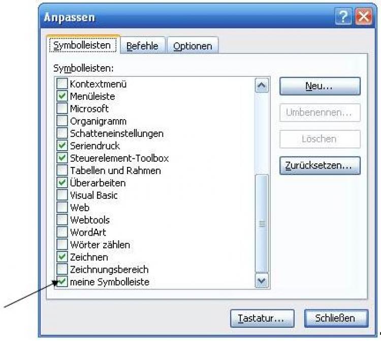 Achten Sie darauf, dass die Symbolleiste in der Normal.dot verfügbar gemacht wird und überschreiben Sie benutzerdefiniert1 mit dem neuen Namen "meine symbolleiste".