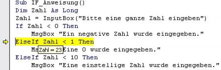 Die aktuelle (gelb angezeigte) Anweisung wird als nächste vom VBA-Interpreter interpretiert und ausgeführt.