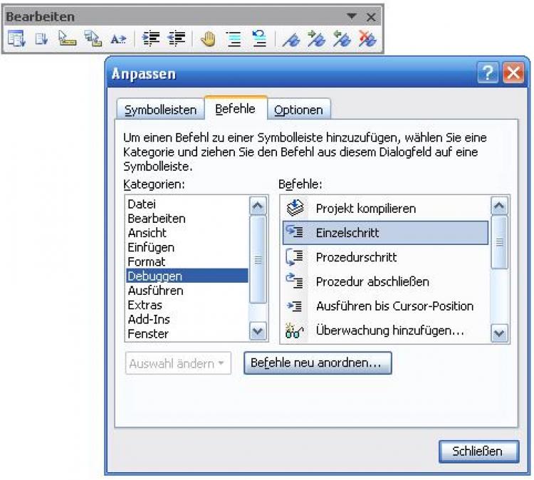 Für das Debuggen, wie in VBA die Fehlerbeseitigung auch genannt wird, ist es sinnvoll die Symbolleiste Bearbeiten über "Ansicht" - "Symbolleisten" - "Anpassen" einzublenden.