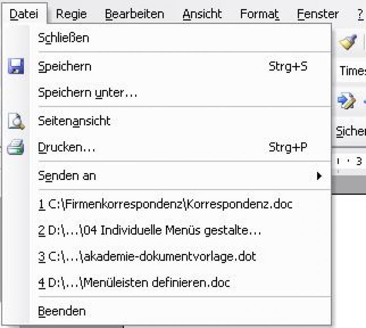 Sie können Ihre Bedienumgebung selbst gestalten. Im Dokument Korrespondenz.doc wurde die Standardmenüleiste ("Menu Bar")verändert. Einige Menüs fehlen vollständig, andere wurden verkürzt, ein weiteres wurde eingefügt.