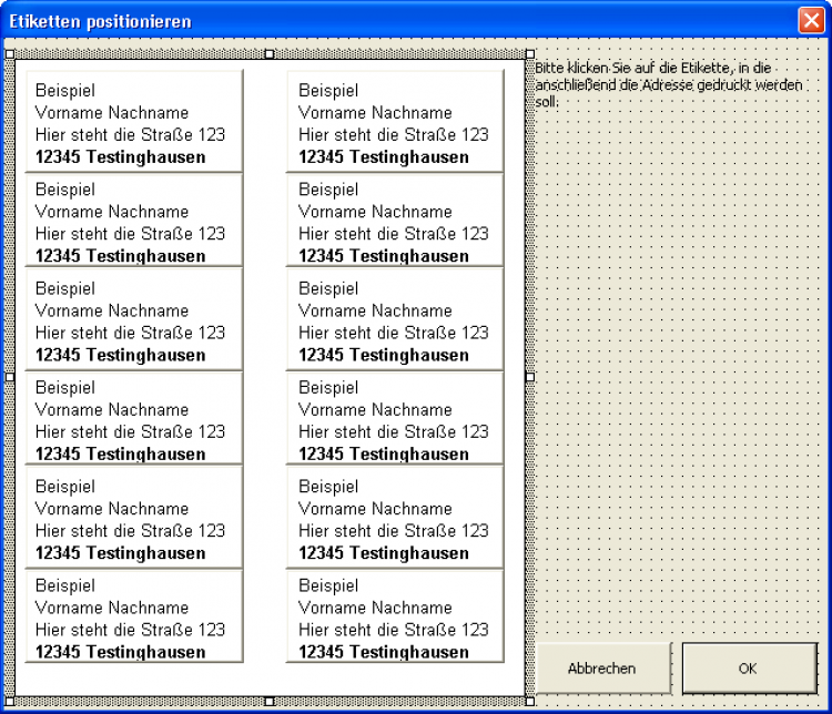 Ein Klick auf das jeweilige Etikett soll dieses für den geplanten Ausdruck markieren. In der Grafik sind daher möglichst exakt Schaltflächen über die Etiketten gelegt worden. Deren BackStyle-Eigenschaft ist auf fmBackStyleTransparent gestellt, so dass das Bild noch sichtbar bleibt.