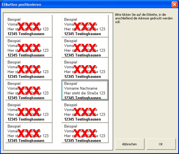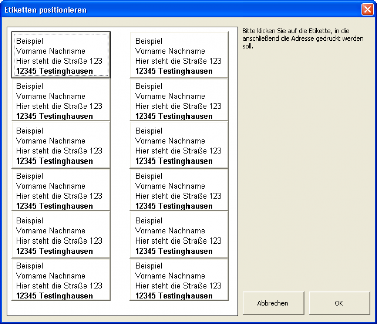 Im folgenden Beispiel eines fiktiven Etiketten-Assistenten enthält der Dialog eine einzige Grafik für die zwölf Etiketten. Die zwölf Schaltflächen sind ebenfalls schon darauf angelegt und am Rahmen zu erkennen.